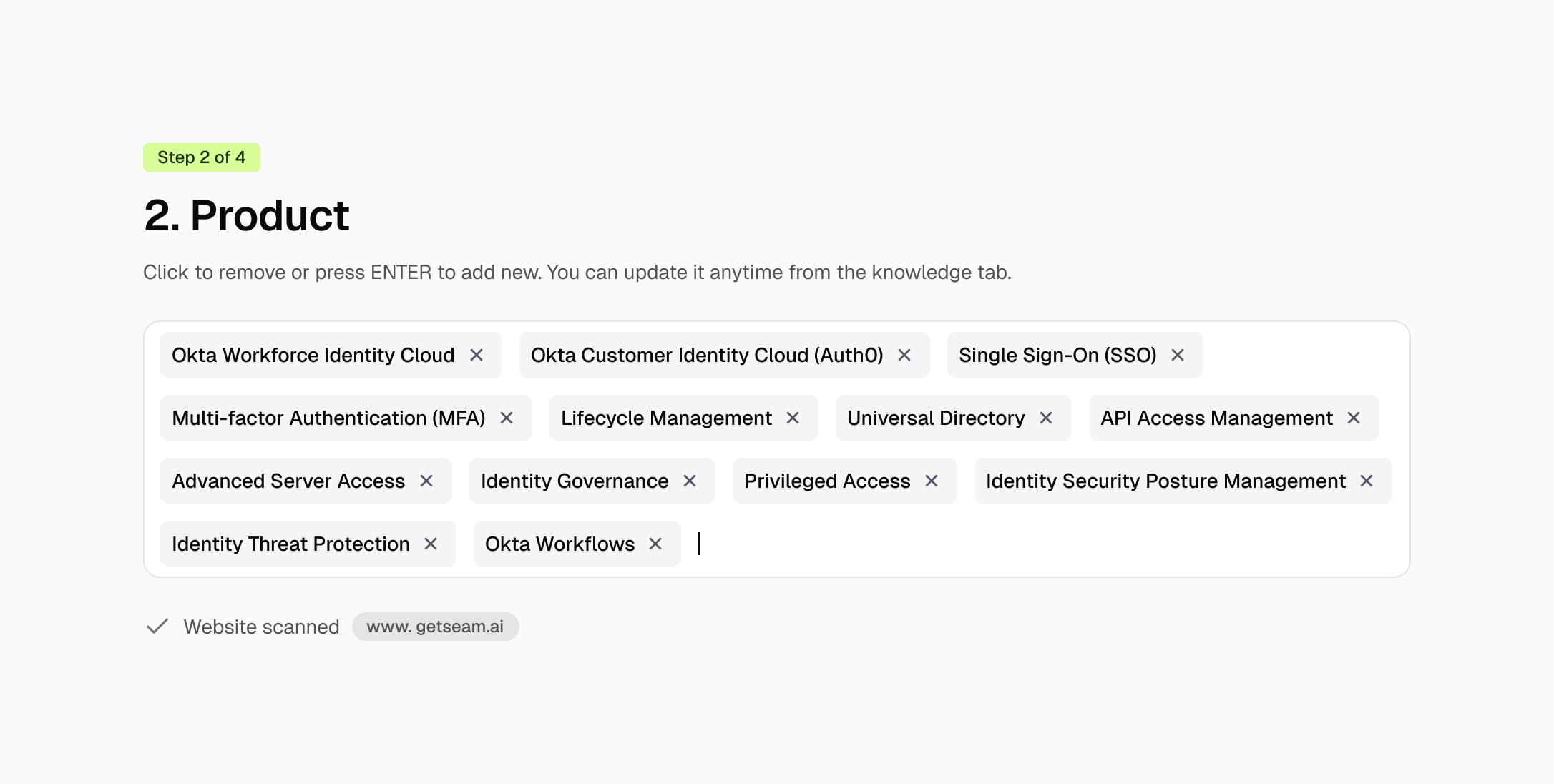 Designed the onboarding experience to convert raw company data into editable AI knowledge that powers generative features. Solved the cold-start problem through minimal input requirements while maintaining output accuracy, with user validation and intervention touchpoints.