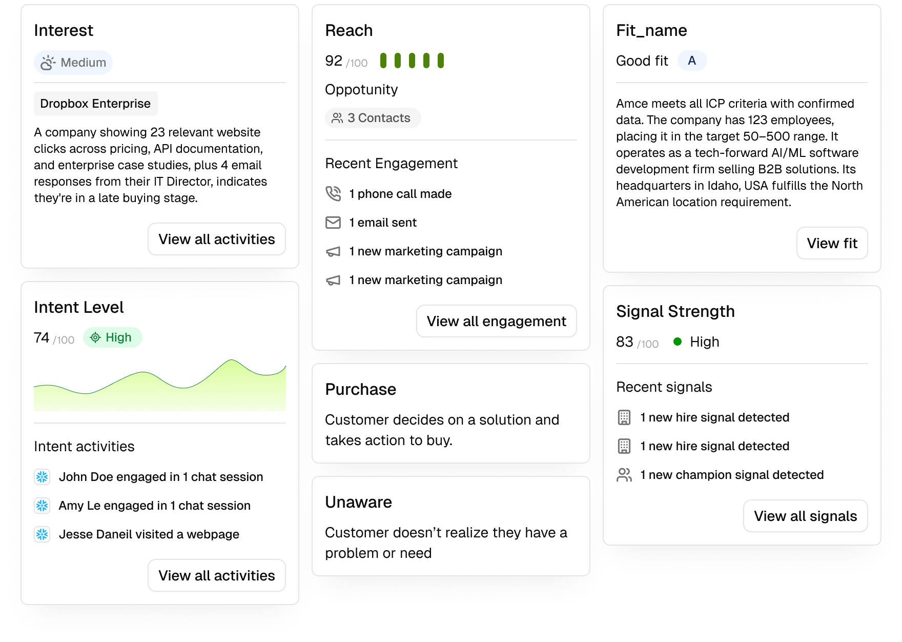 Designed the intelligence layer atop our data model with transparent scoring and intent surfaces. Made AI decision-making visible and actionable by opening the black box, increasing user trust