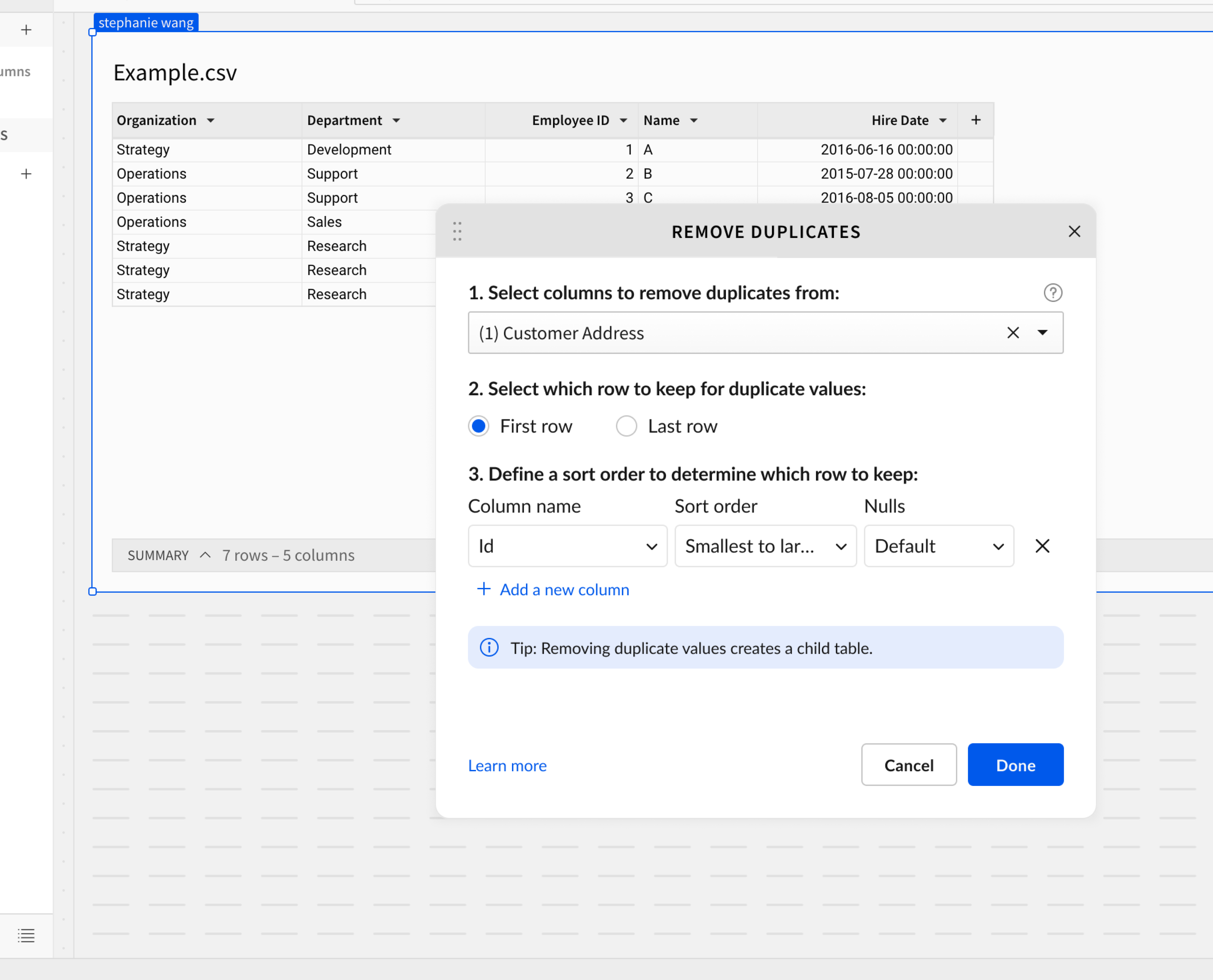 Led end-to-end design for the entry point, configuration modal, and results view for removing duplicate rows in workbook tables. Reduced clicks by 92% and resolved pain points reported by 32 customer orgs.