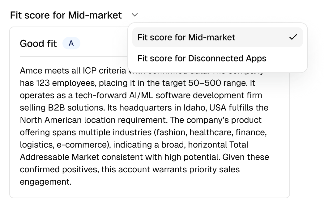 Designed the market's first customizable AI fit scoring, breaking legacy tools' rigid, black-box approach. Users backtest scoring logic before running full research, see why accounts match their ICP, and compare multiple scores. Achieving 100% adoption and becoming the primary reason customers buy.