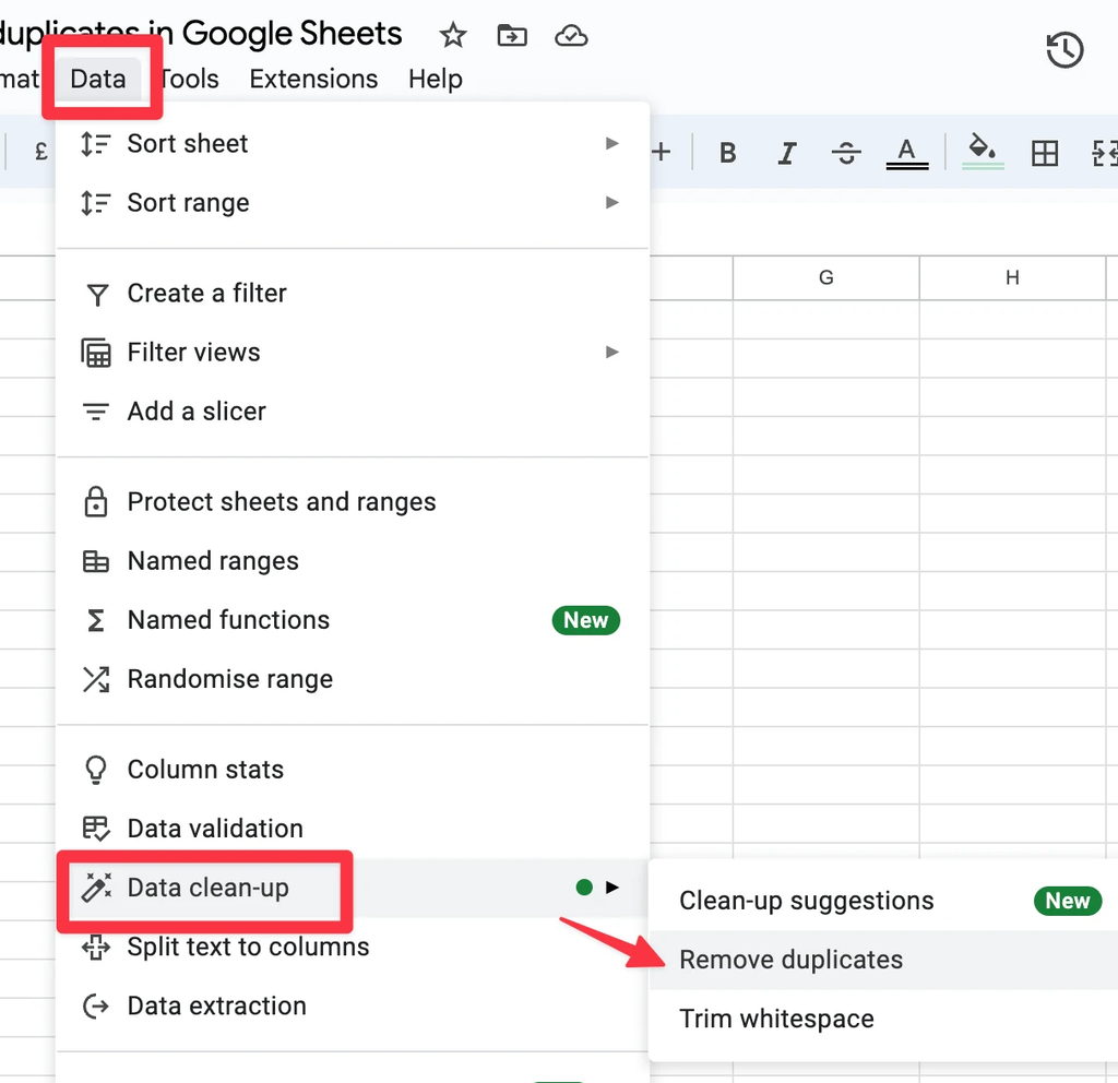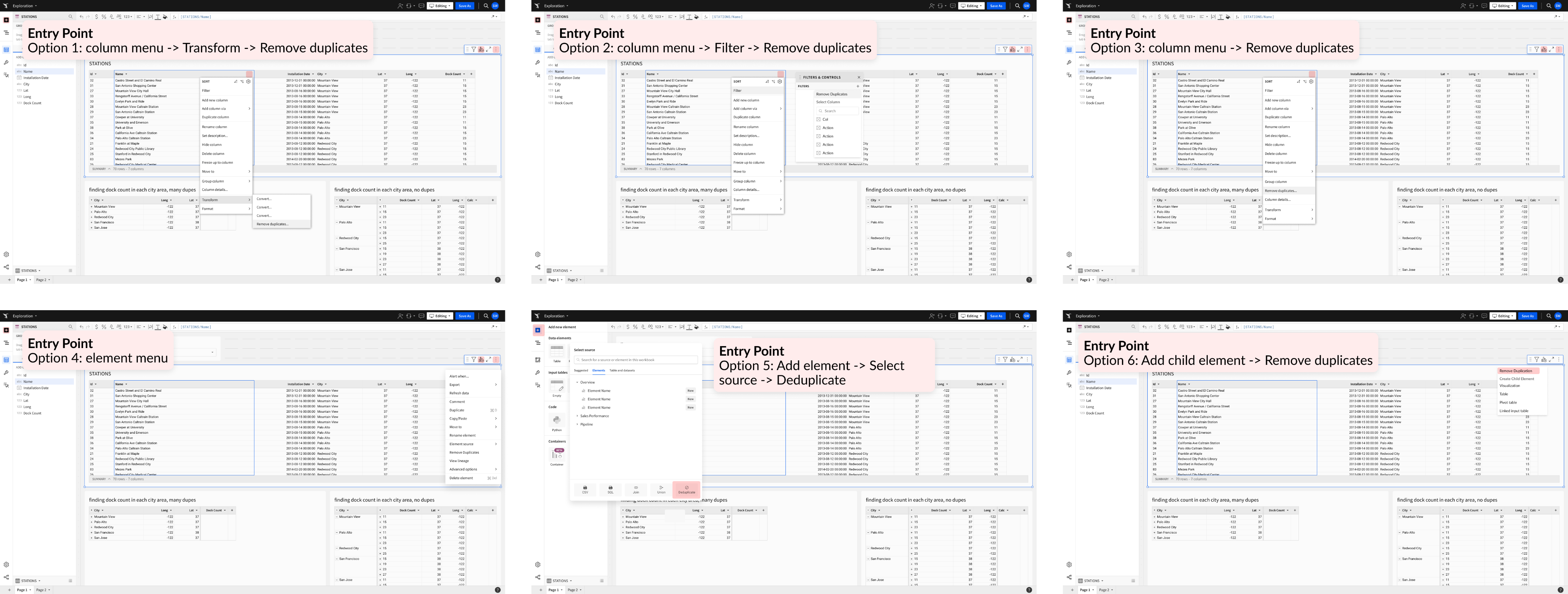 I tested 6 potential entry points through prototypes. Users consistently expected to find the feature in the column menu, so I placed it there even though removing duplicates is technically an element-level action.