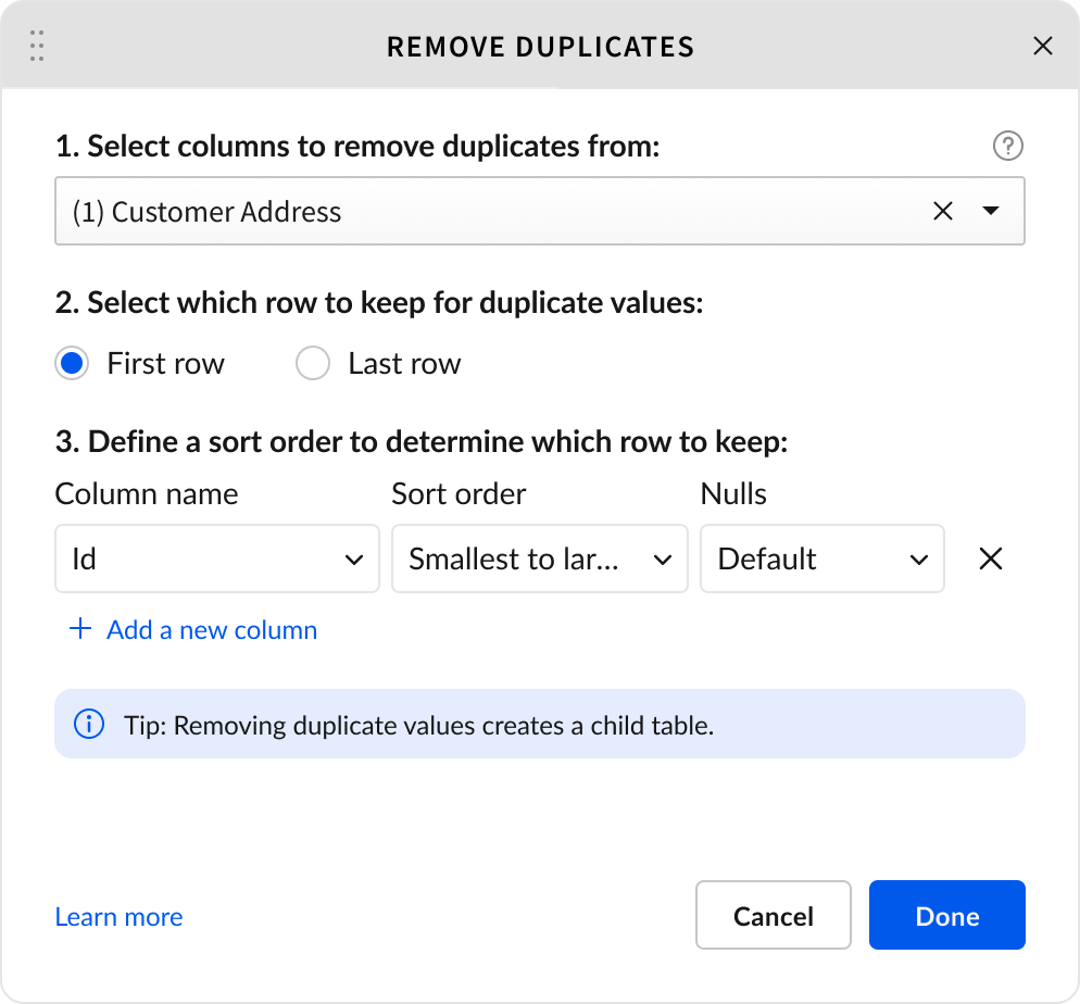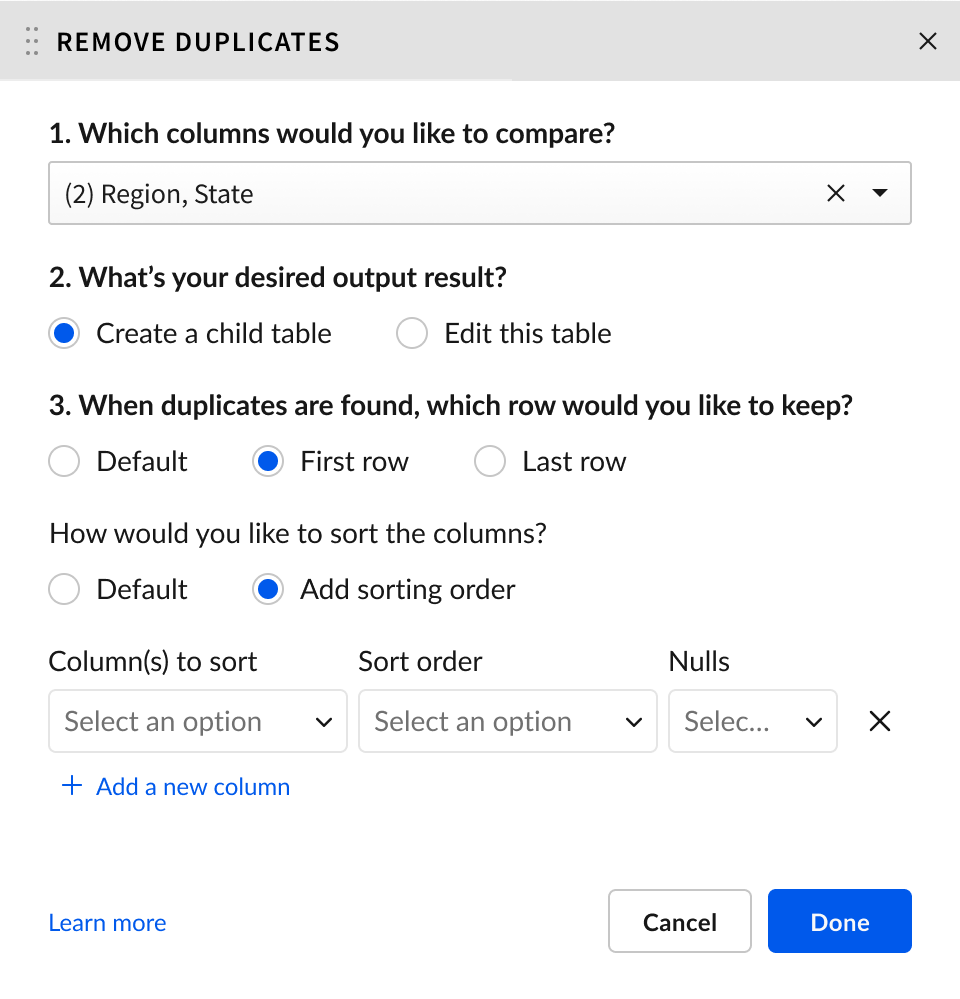The configuration modal auto-selects comparison columns based on the user's context and clearly shows which duplicate will be kept (first or last row based on sort order). I worked with a content writer to develop clear instructional copy and designed the interface to use smart auto-selection rather than confusing "default" checkboxes.