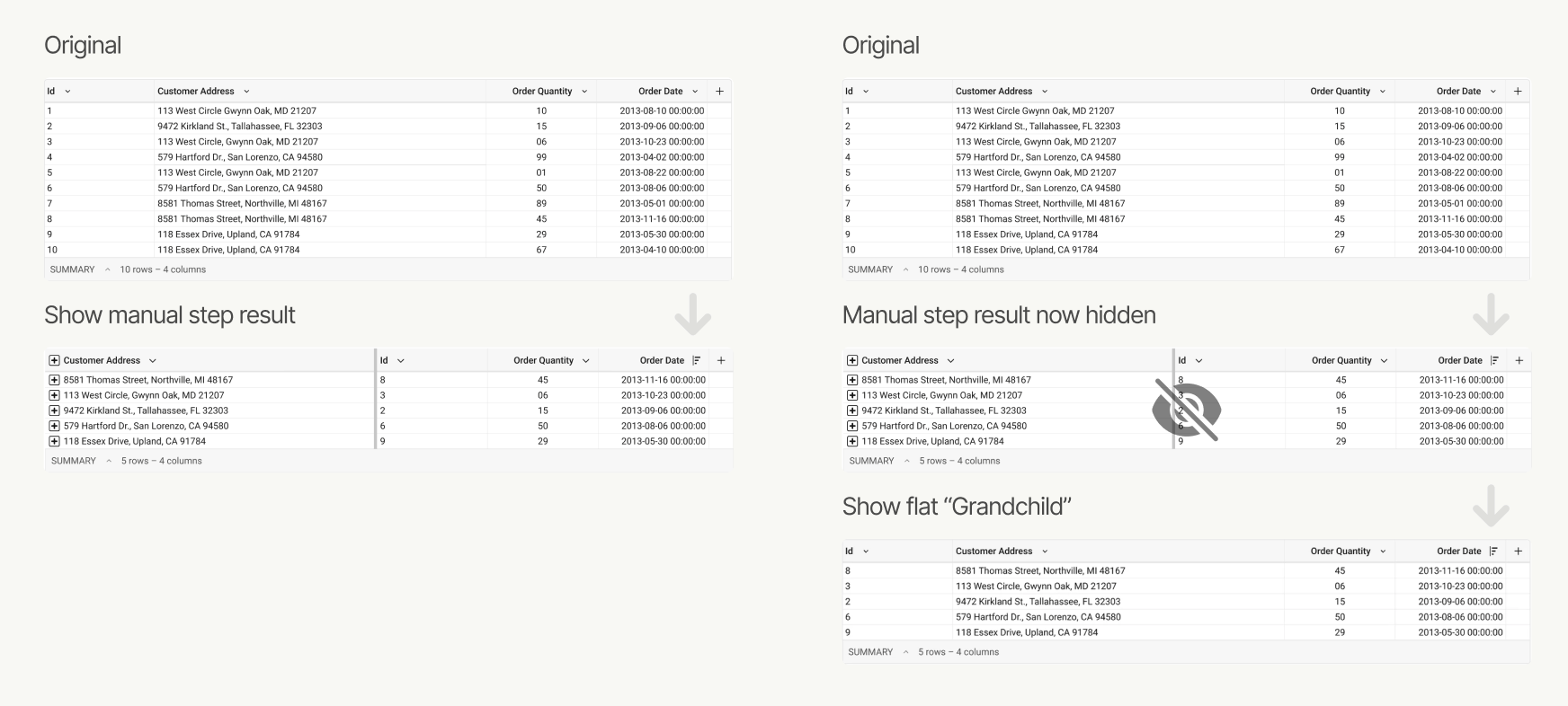 The system always creates a child table to preserve the original data. I hid the intermediate grouping step (leveraging existing code without exposing the complexity to users) and showed them a clean "grandchild" table as the final result they interact with.