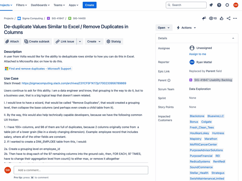 Sigma is a cloud BI tool that combines Excel's familiarity with enterprise analytics power. Removing duplicate rows was the #1 most-requested feature from support engineers, but the only workaround required complex "grouping" knowledge that confused users.