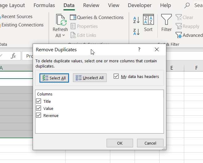 We couldn't simply copy Excel's 2-click feature due to fundamental product differences. Spreadsheets work with individual cells while Sigma operates on entire rows. Cloud-based data updates also required deterministic results, meaning users needed to specify which duplicates to keep. Additionally, users needed control over comparison logic, choosing whether to compare all columns or specific ones.
