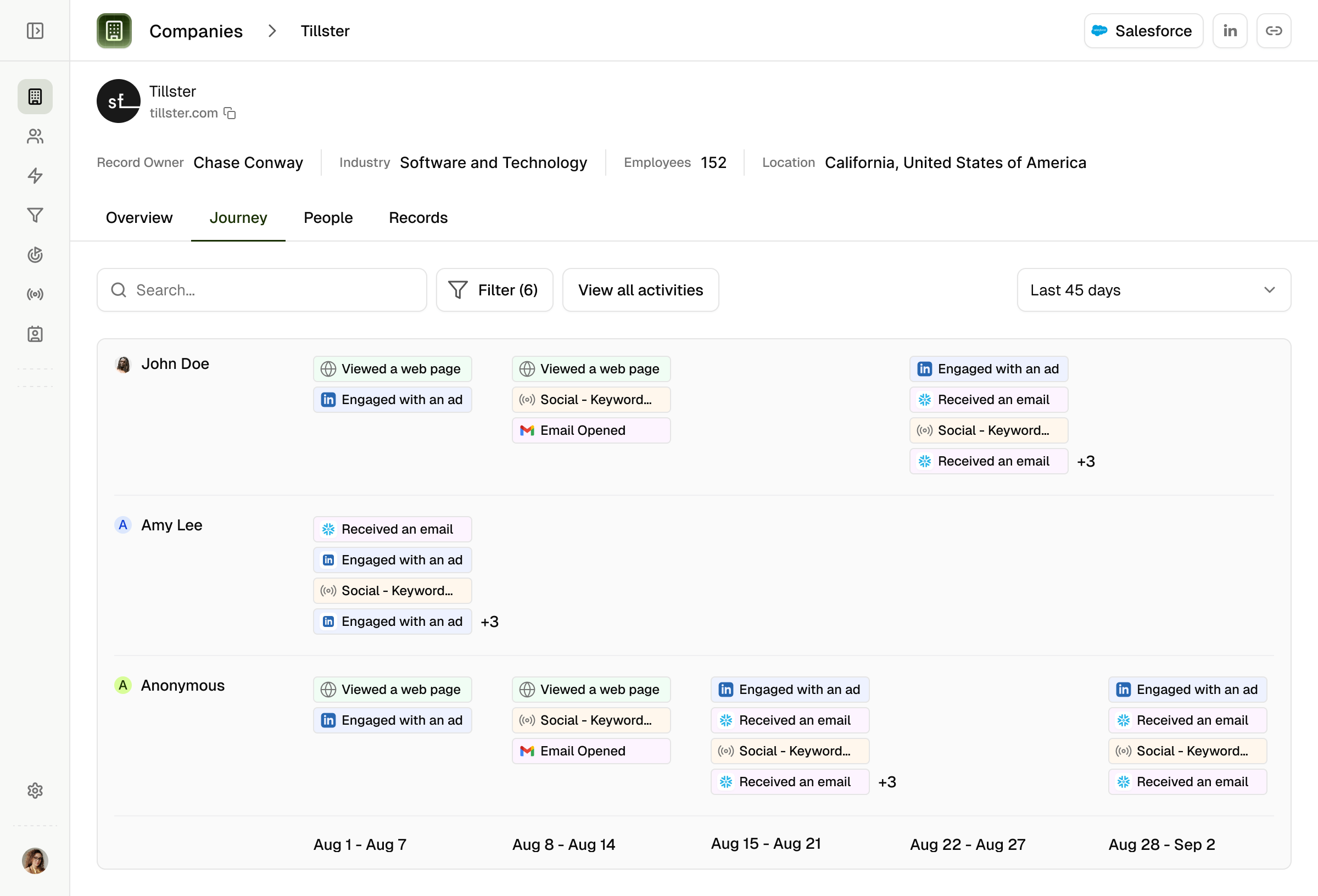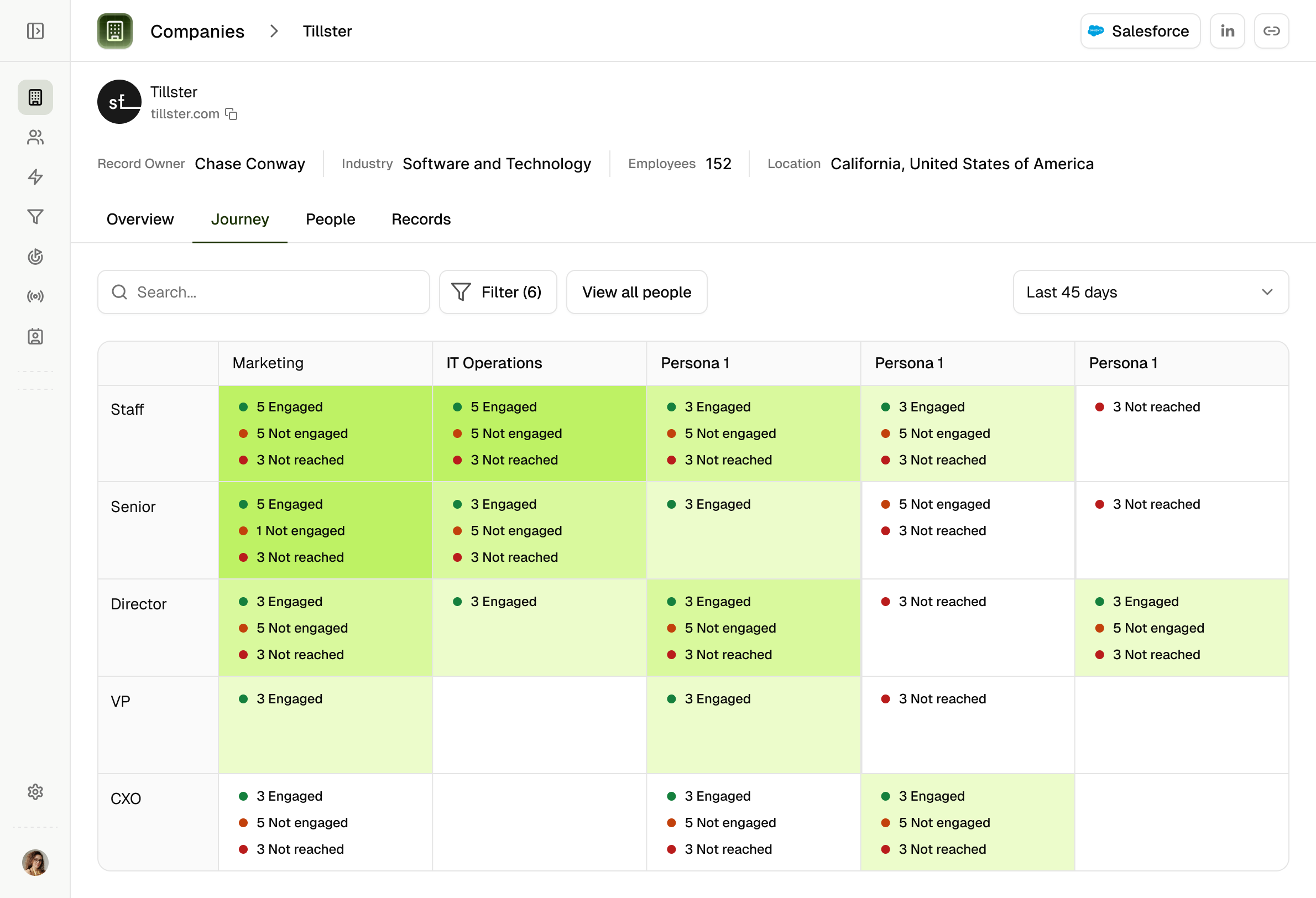 Designed dual-view system for account intelligence: timeline for engagement tracking, matrix for persona-level analysis. Solved the "too much data" problem by letting users switch contexts.