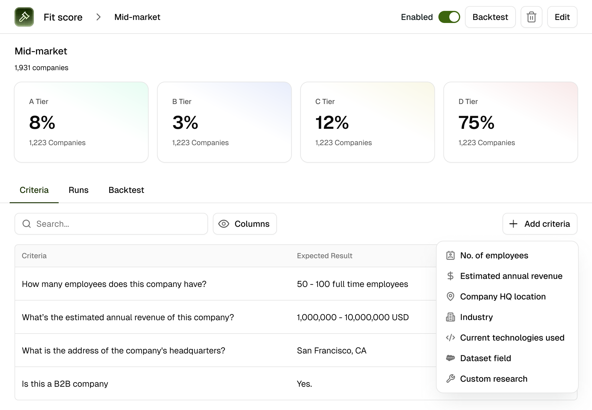 Designed the market's first customizable AI fit scoring, breaking legacy tools' rigid, black-box approach. Users backtest scoring logic before running full research, see why accounts match their ICP, and compare multiple scores. Achieving 100% adoption and becoming the primary reason customers buy.